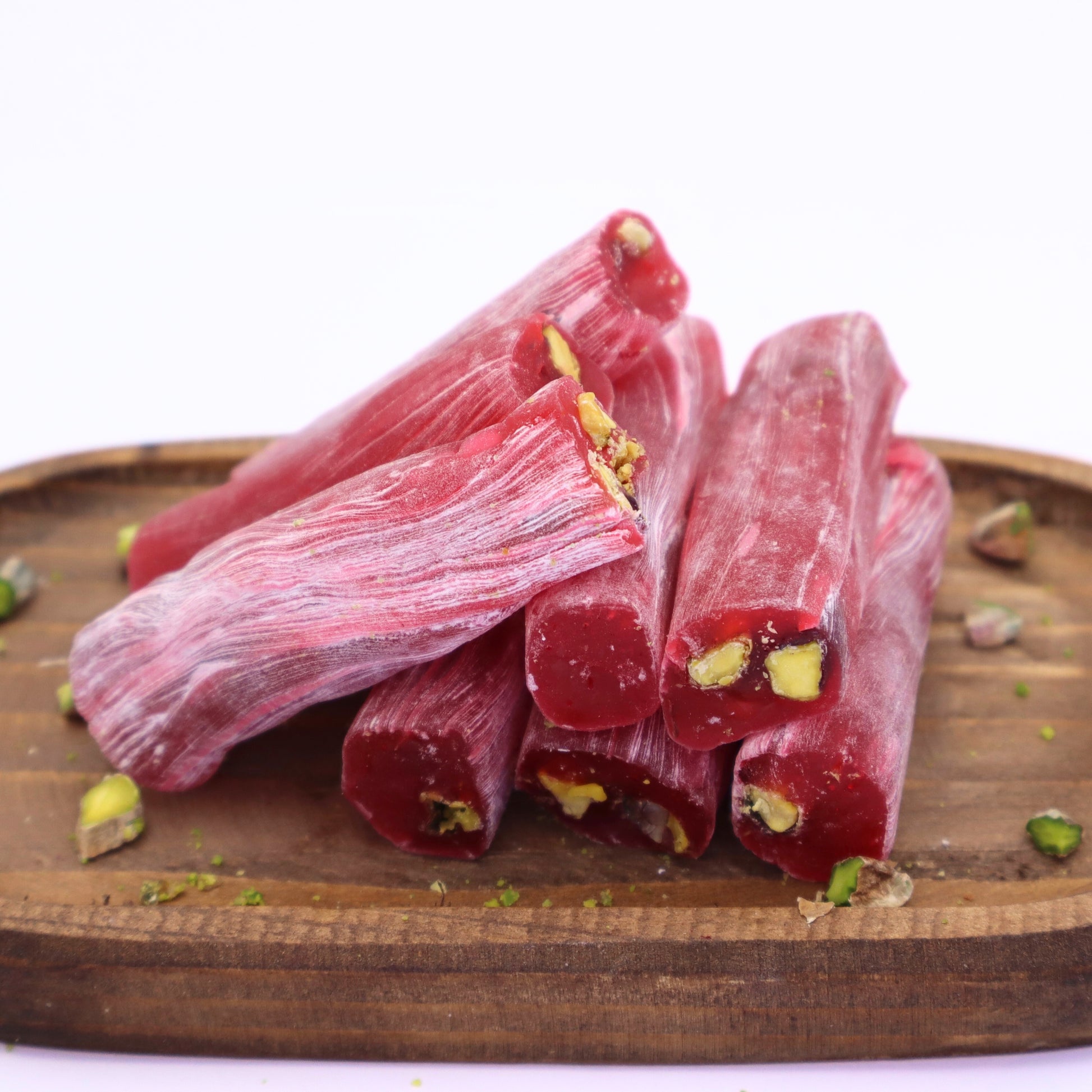 Pistazien-Granatapfel-Fitil-Lokum ist eine raffinierte türkische Süßigkeit, die den fruchtigen Geschmack von Granatapfel mit der nussigen Note hochwertiger Pistazien vereint. Lokum, auch bekannt als "Türkischer Honig", ist eine weiche, zähe Köstlichkeit, die traditionell aus Zucker und Stärke hergestellt wird. Diese Variante, bestreut mit feinem Puderzucker, bietet eine einzigartige Kombination aus Süße und Frische – perfekt für alle, die orientalische Spezialitäten lieben.
